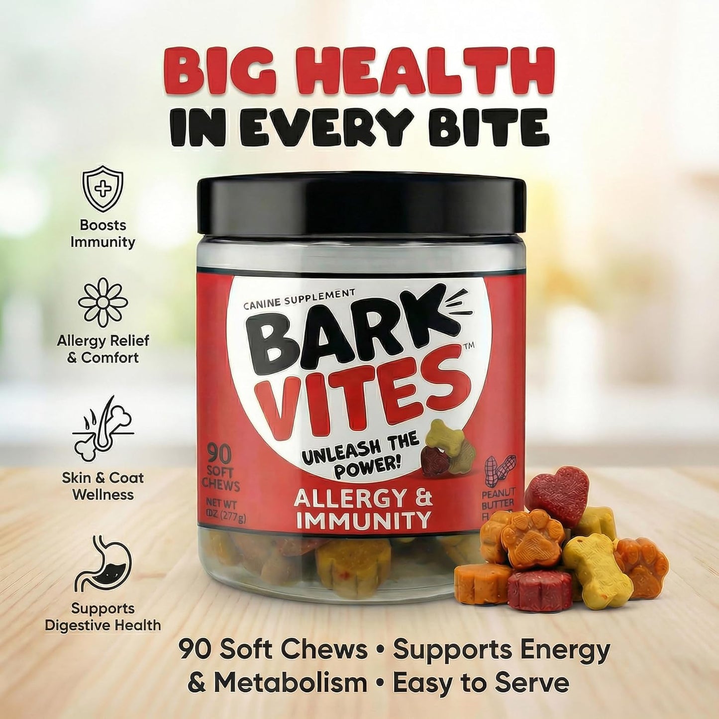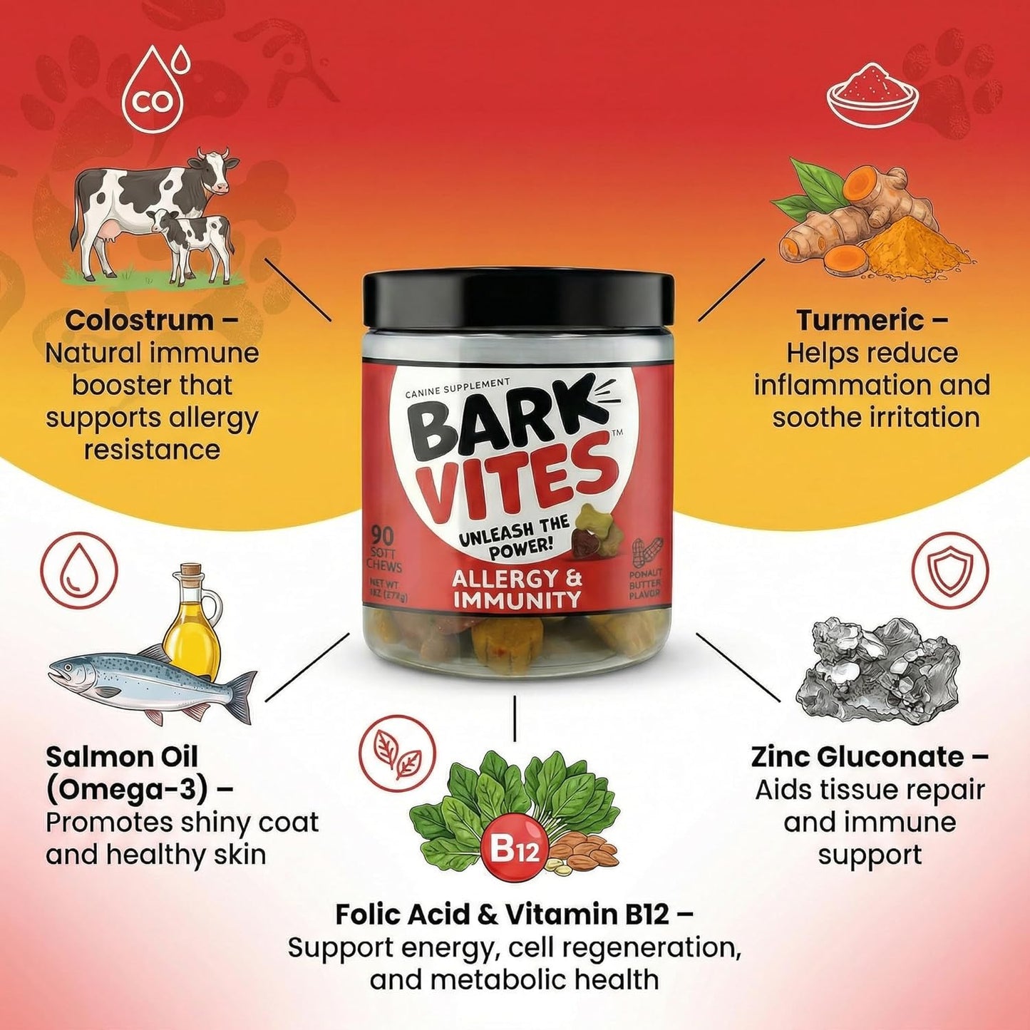 Soothe your dog’s allergies and strengthen their immune system with our premium Allergy & Immunity Support Formula. Expertly crafted with Colostrum, Turmeric, Salmon Oil, and Zinc Gluconate, this supplement helps your pet stay comfortable, healthy, and vibrant from the inside out.