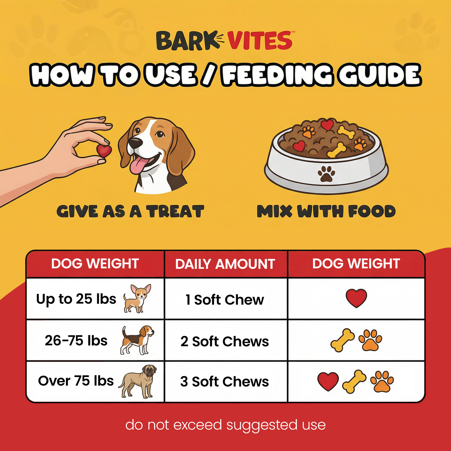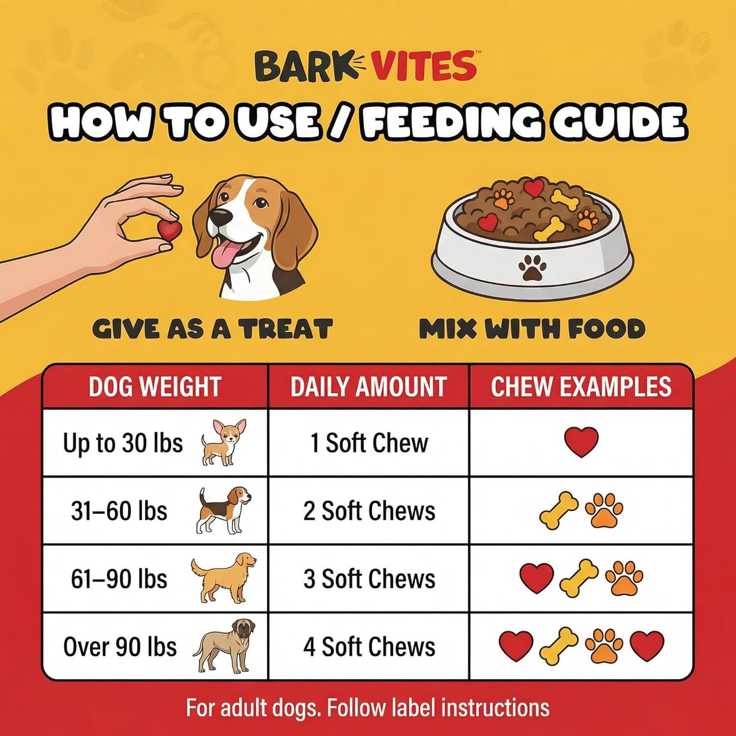 Give once daily based on the weight chart on the label (e.g., 1 chew per 25 lb—don't exceed the maximum). With or after food for sensitive tummies. Split doses AM/PM if preferred. For picky pups: Crunch and mix with food, wrap in a soft treat, or hand-feed as a high-value reward. Most dogs go wild for the peanut-butter flavor!